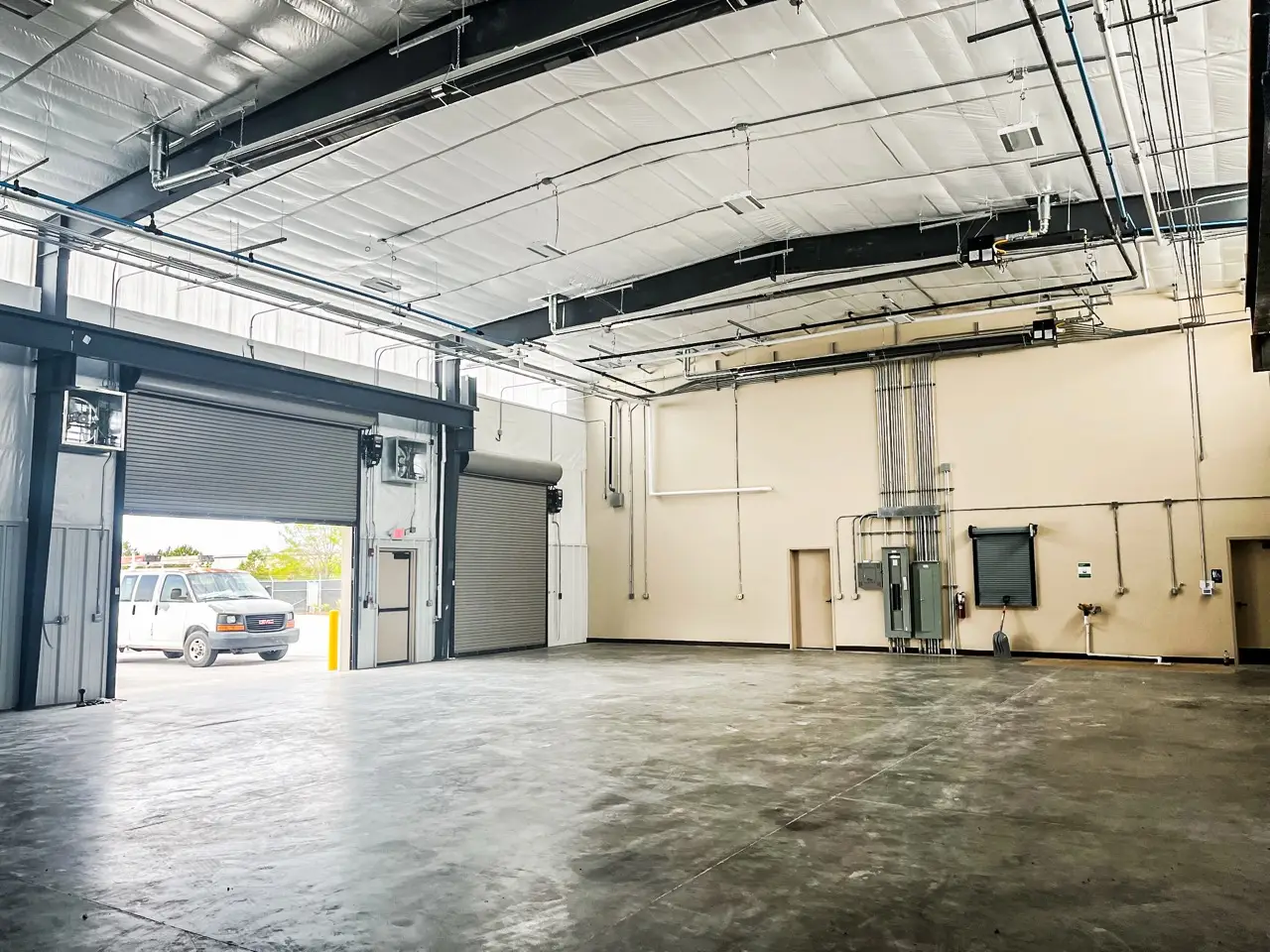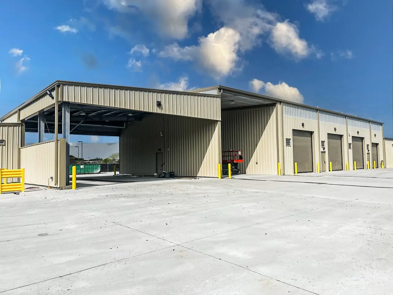 The facility features drive-through wash and repair bays, an oil/water separator, exterior fuel tank infrastructure, and enhanced site access for large vehicle circulation.