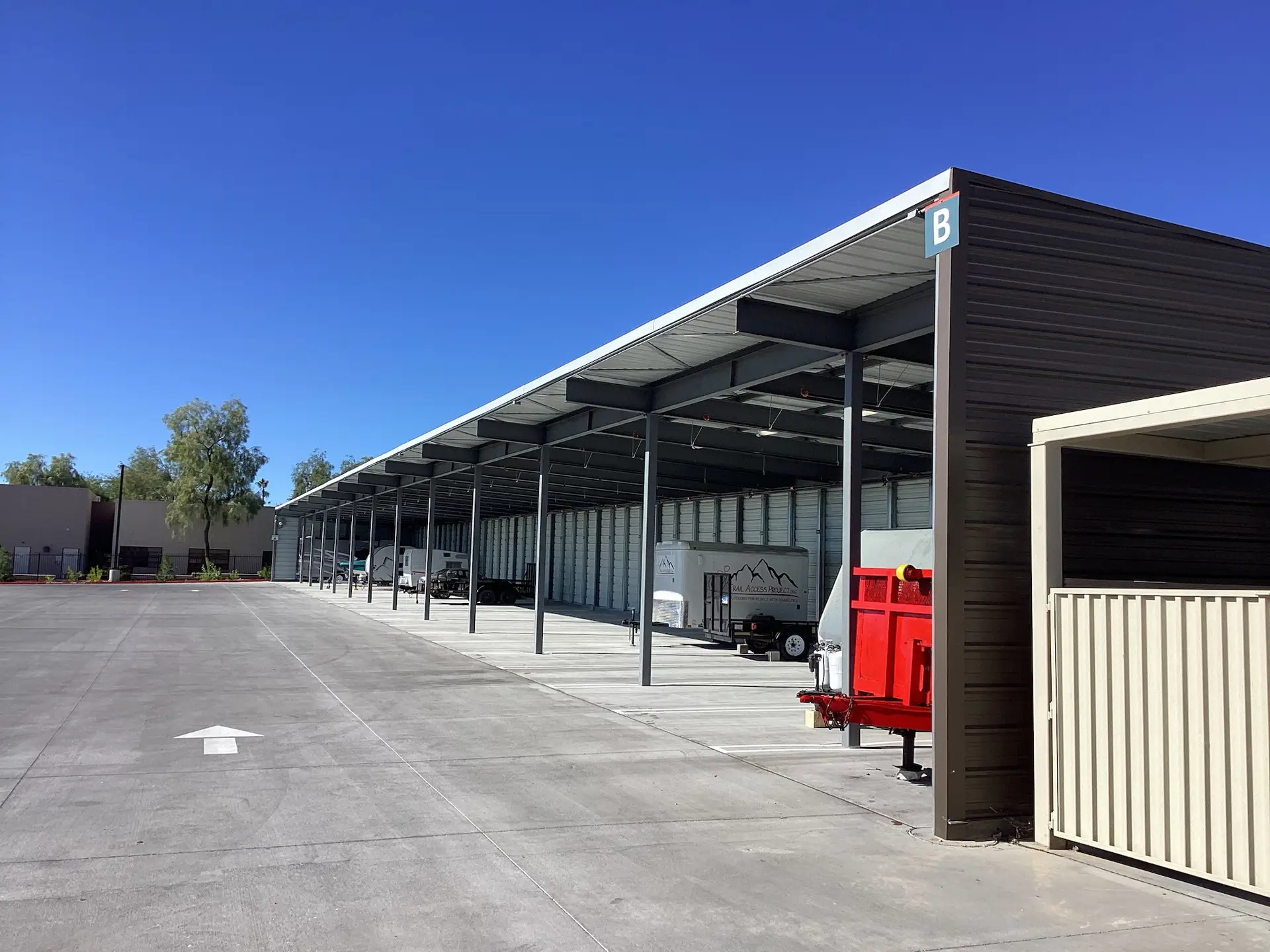 The project included the construction of a rental office, covered RV parking, carports, and extensive site improvements such as walkways and landscaping.